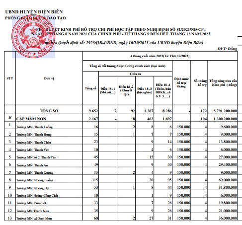 CÔNG KHAI DANH SÁCH TRẺ EM MẪU GIÁO ĐƯỢC HỖ TRỢ CHI PHÍ HỌC TẬP THÁNG 9-12/2023