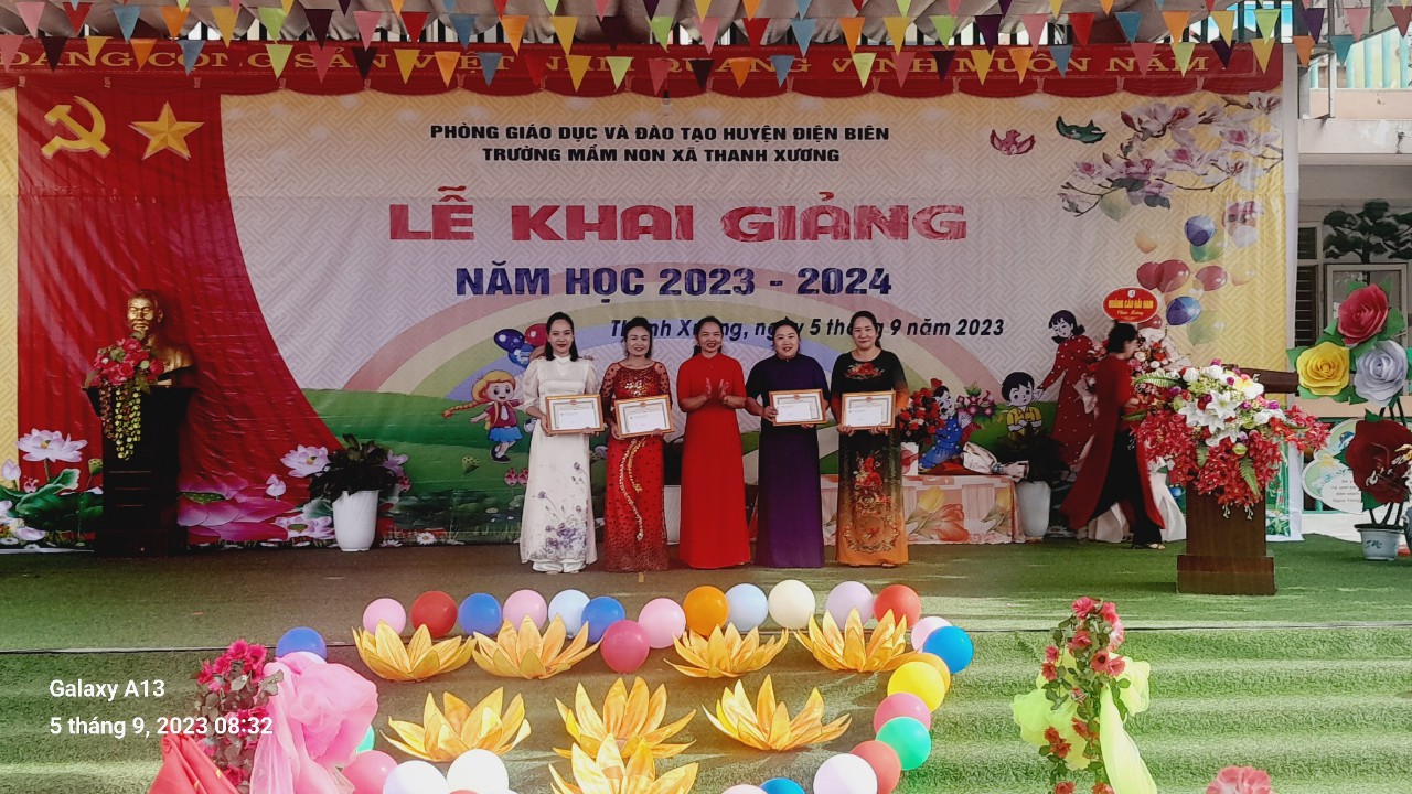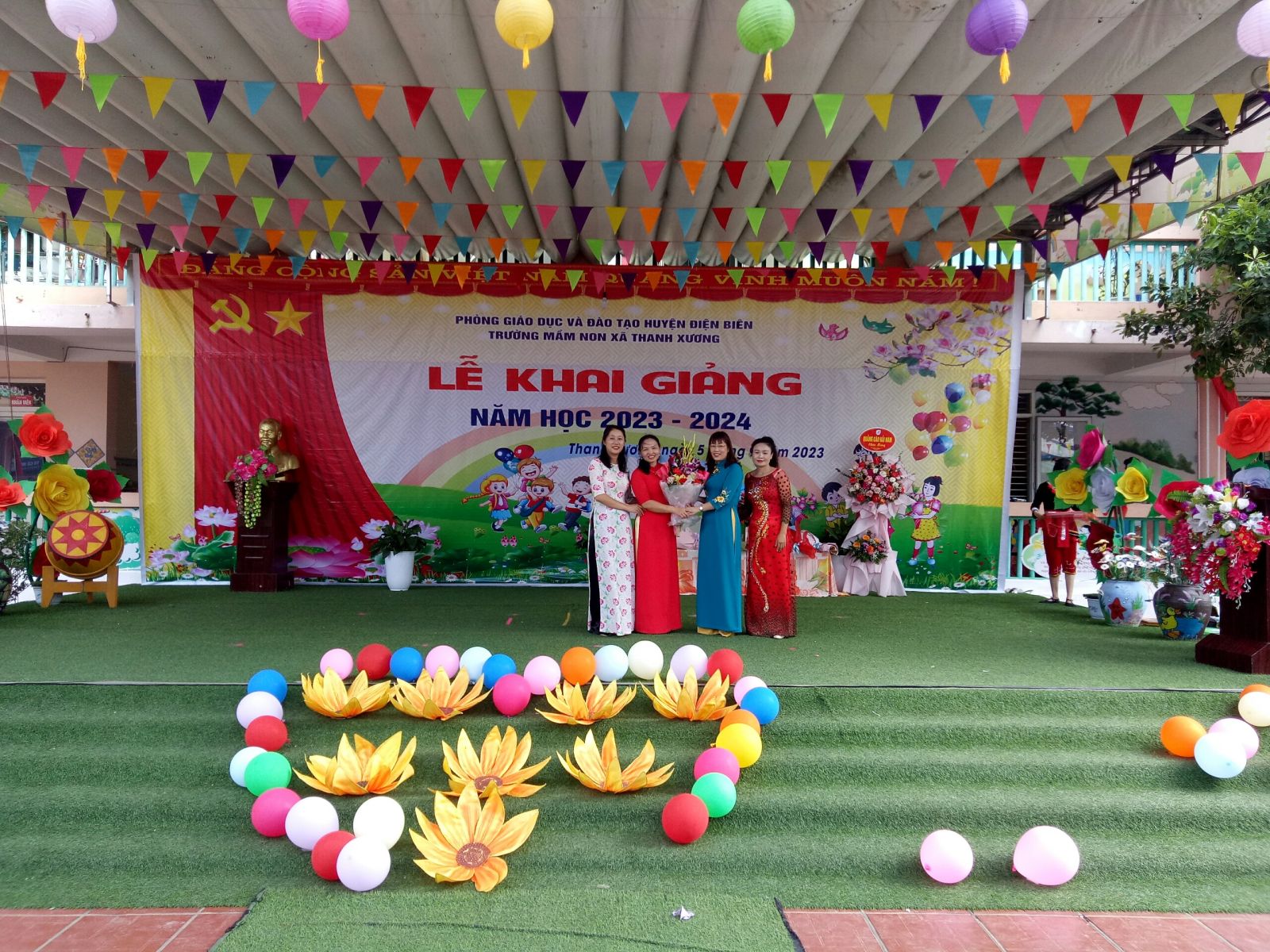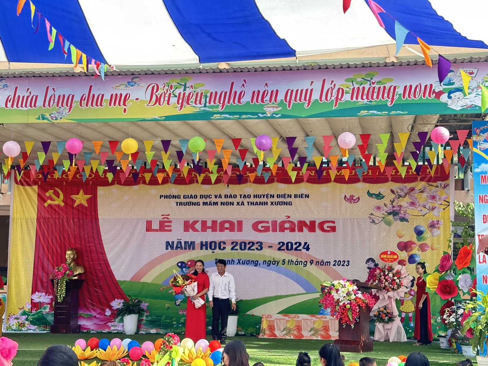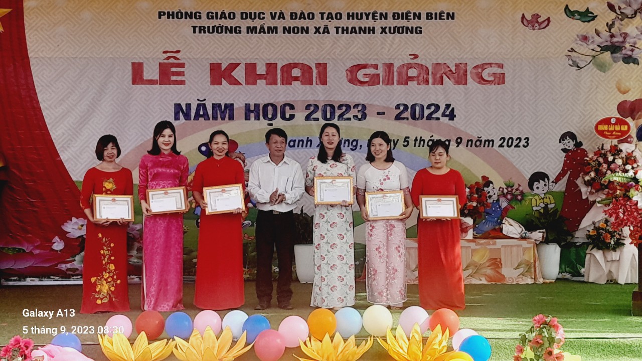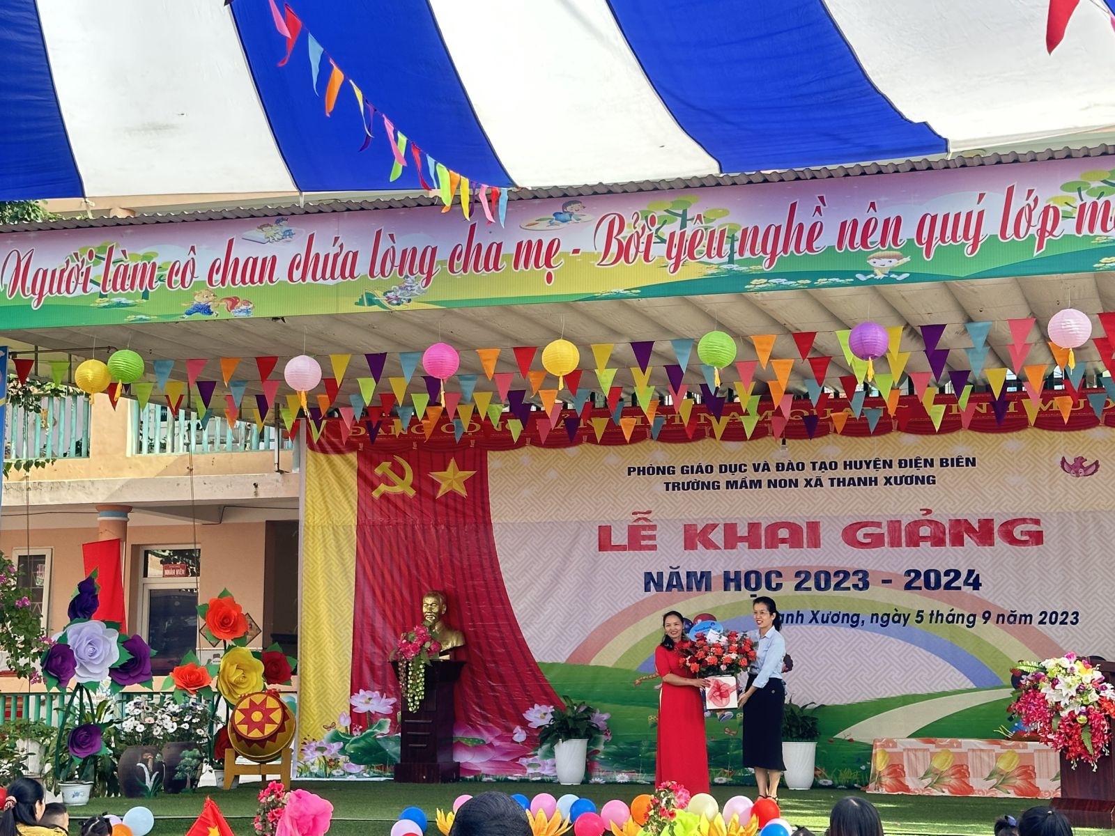 Cùng trong buổi lễ khai giảng, tập thể nhà trường đã được các đồng chí lãnh đạo Ủy ban nhân dân huyện, xã Thanh Xương, các đơn vị kết nghĩa, doanh nghiệp, cha mẹ trẻ tặng hoa, động viên chúc mừng nhà trường. Ban thi đua nhà trường đã thay mặt các cấp trao khen thưởng cho tập thể nhà trường và các cán bộ, giáo viên đạt thành tích xuất sắc trong năm học 2022-2023.