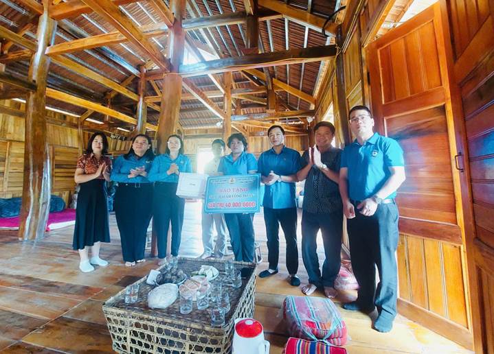 Các đ/c Lãnh đạo LĐLĐ tỉnh Vĩnh Phúc, LĐLĐ tỉnh Điện Biên, LĐLĐ huyện Điện Biên trao nhà mái ấm công đoàn cho đoàn viên Lù Thị Hằng – Công đoàn viên trường MN xã Hua Thanh bị mắc bệnh hiểm nghèo.