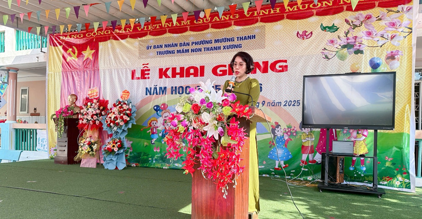 Đồng chí Bùi Thị Phương Thuý trưởng phòng Văn hóa – Xã hội phường Mường Thanh đại diện lãnh đạo Phường Mường Thanh đã trân trọng đọc Thư của Chủ tịch nước gửi ngành Giáo dục nhân dịp khai giảng, khẳng định niềm tin và kỳ vọng vào đội ngũ nhà giáo và các thế hệ học sinh.
