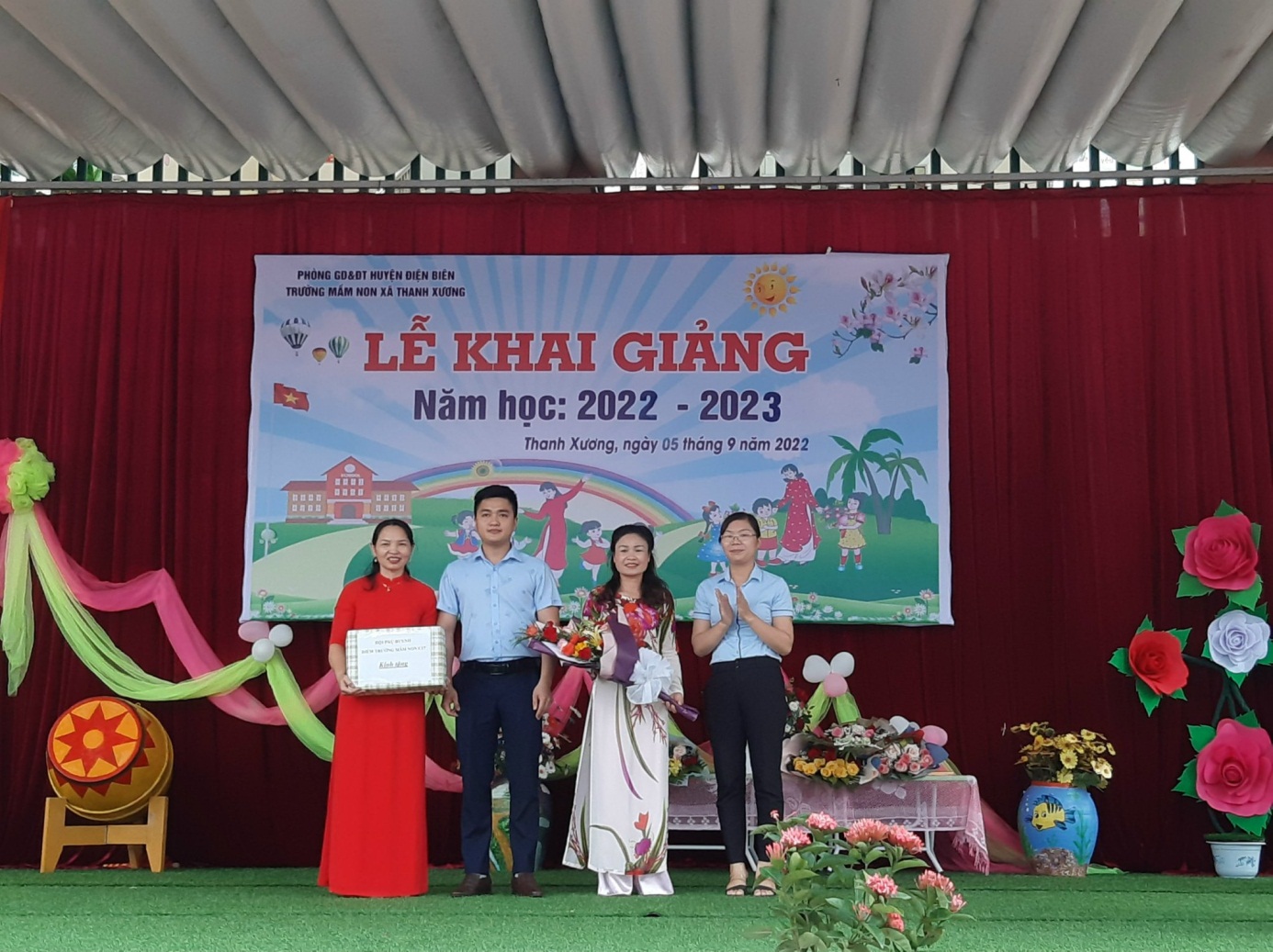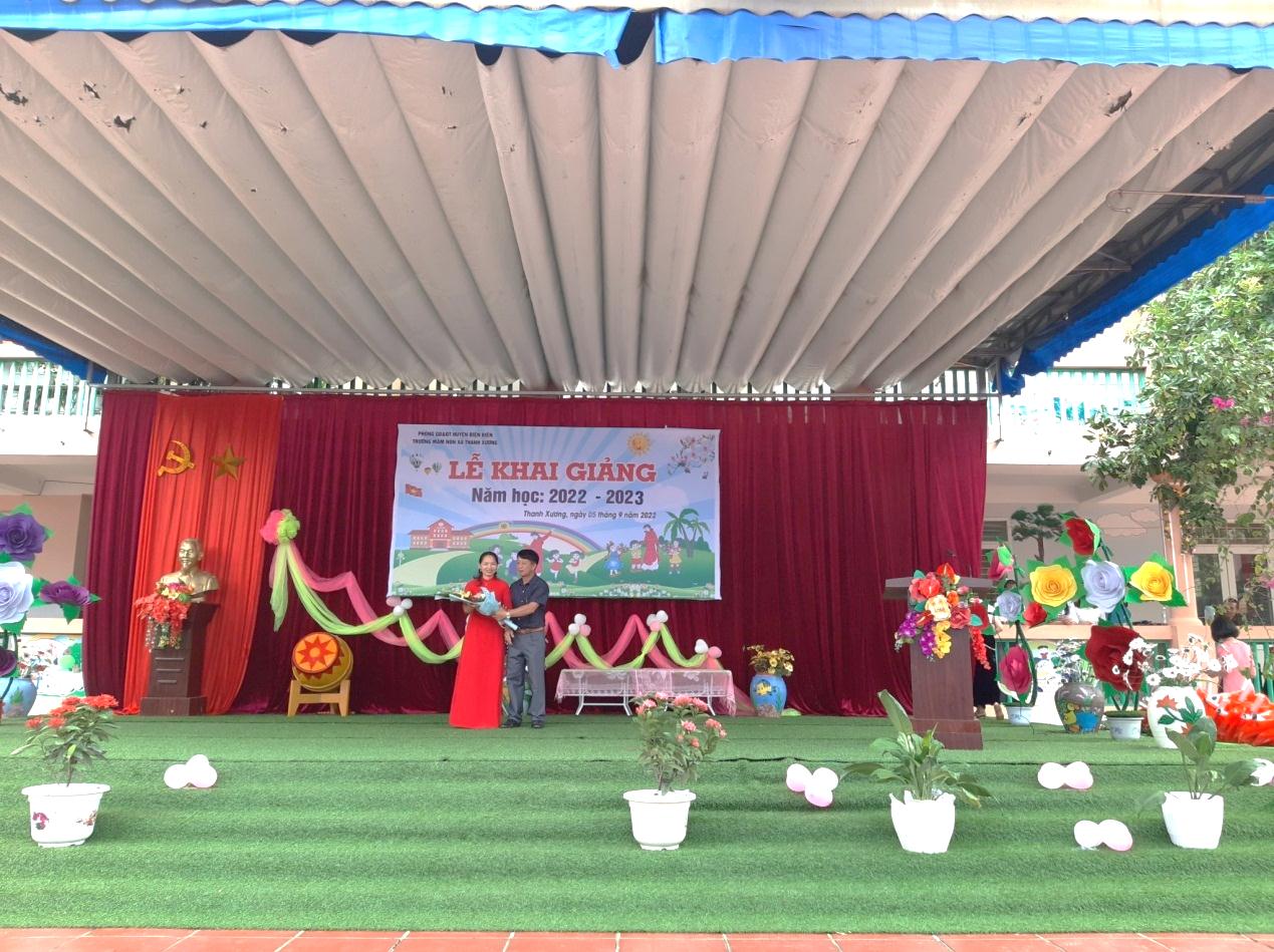 Đ/c: Lò Văn Chung – Phó bí thư thường trực Đảng ủy xã Thanh Xương tặng hoa chúc mừng Cô và trò Trường mầm non xã Thanh Xương khai giảng năm học mới